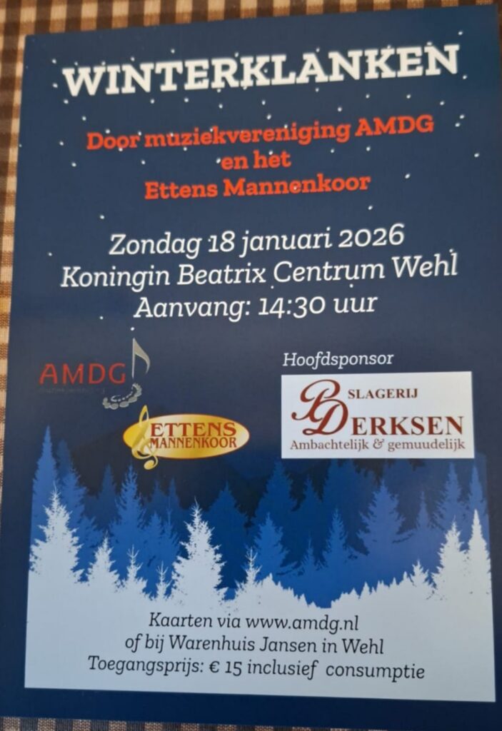 AMDG gaat het jubileumjaar 2026 van start met een concert op zondag 18 januari om 14:30 uur in het Koningin Beatrix Centrum (KBC) in Wehl. Het concert heeft als titel “Winterklanken” meegekregen. Aan het concert werken mee: het fanfareorkest van AMDG onder leiding van Jan Nellestijn en het gerenommeerde, regionaal bekende, Ettens Mannenkoor (EMK) onder leiding van Nick Moritz.